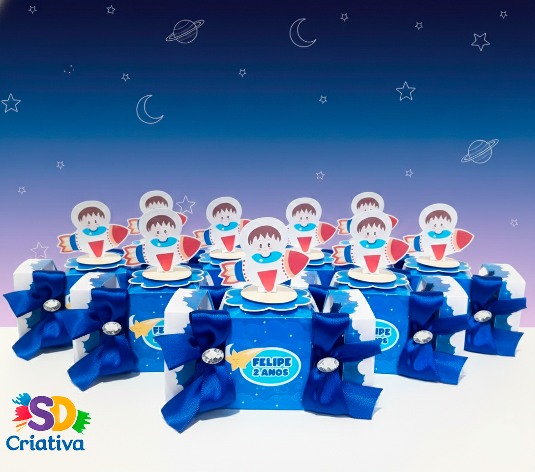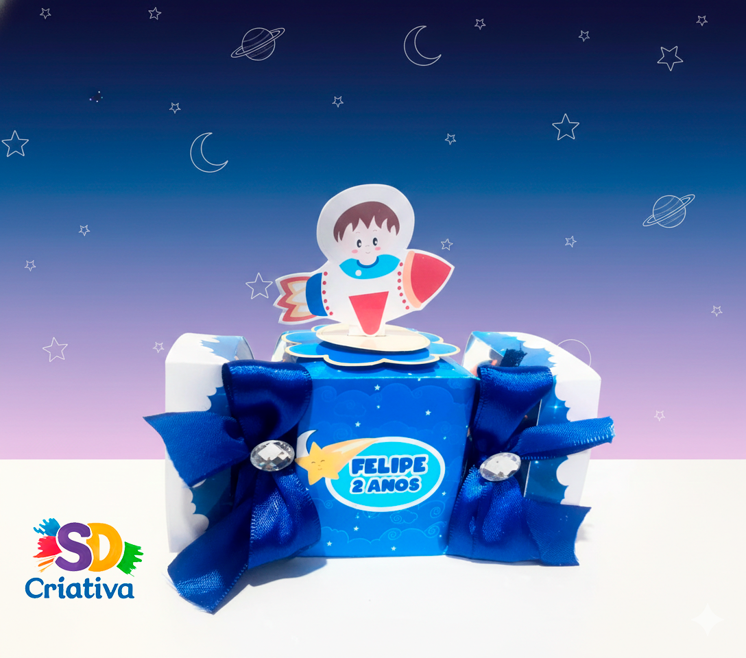 Prepare-se para decolar! A Caixa Bala Astronauta da SD Criativa é o item indispensável para quem deseja uma festa “fora deste mundo”. Com um design que captura a magia do cosmos e a bravura dos pequenos exploradores espaciais, esta peça transforma a sua mesa principal em um verdadeiro cenário galáctico, encantando convidados de todas as idades.