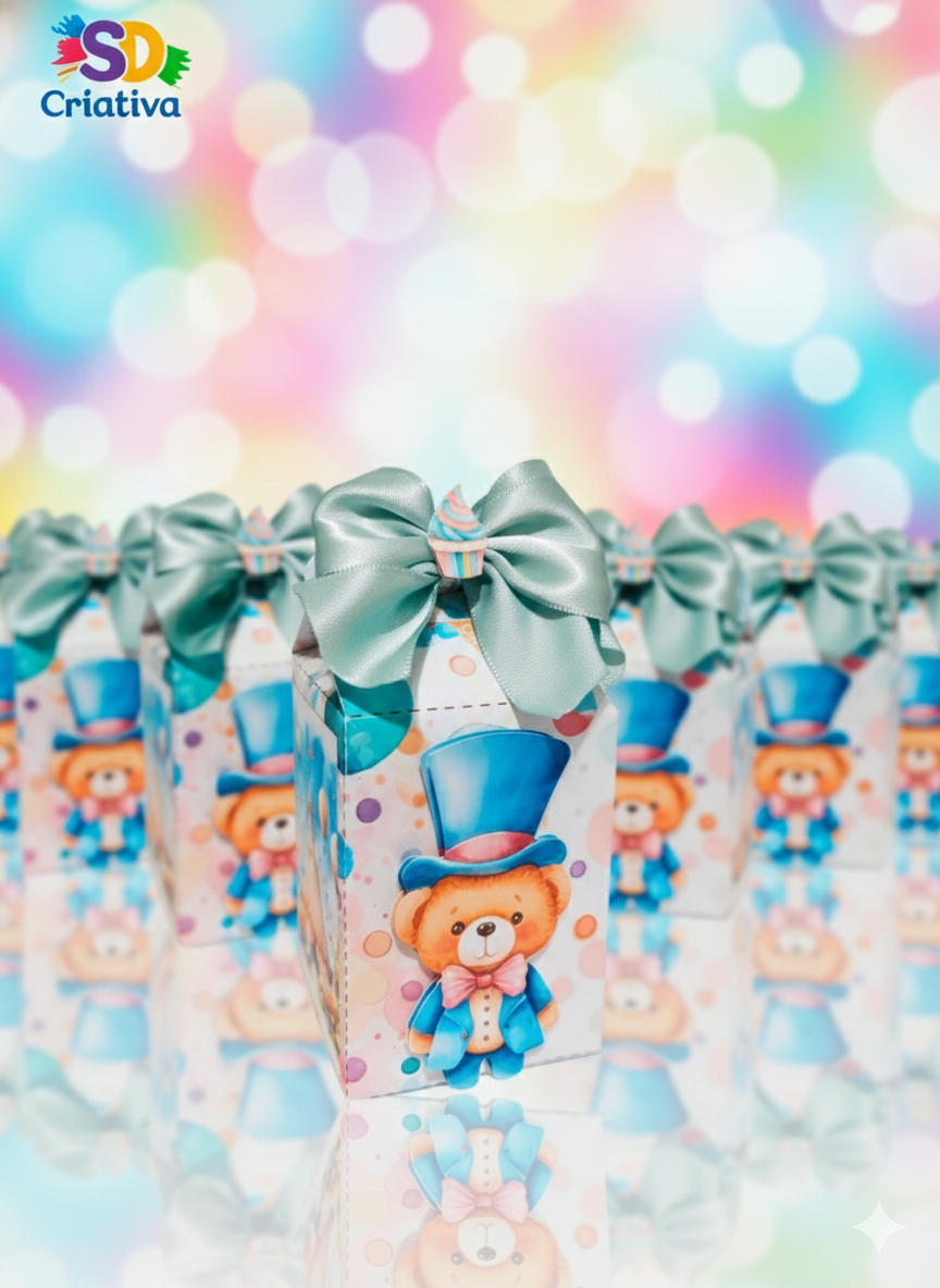 Protagonista Encantador: O ursinho mestre de cerimônias, com sua cartola e gravata borboleta, é aplicado em camadas 3D (scrapbook), trazendo profundidade e um acabamento artesanal de alto padrão.