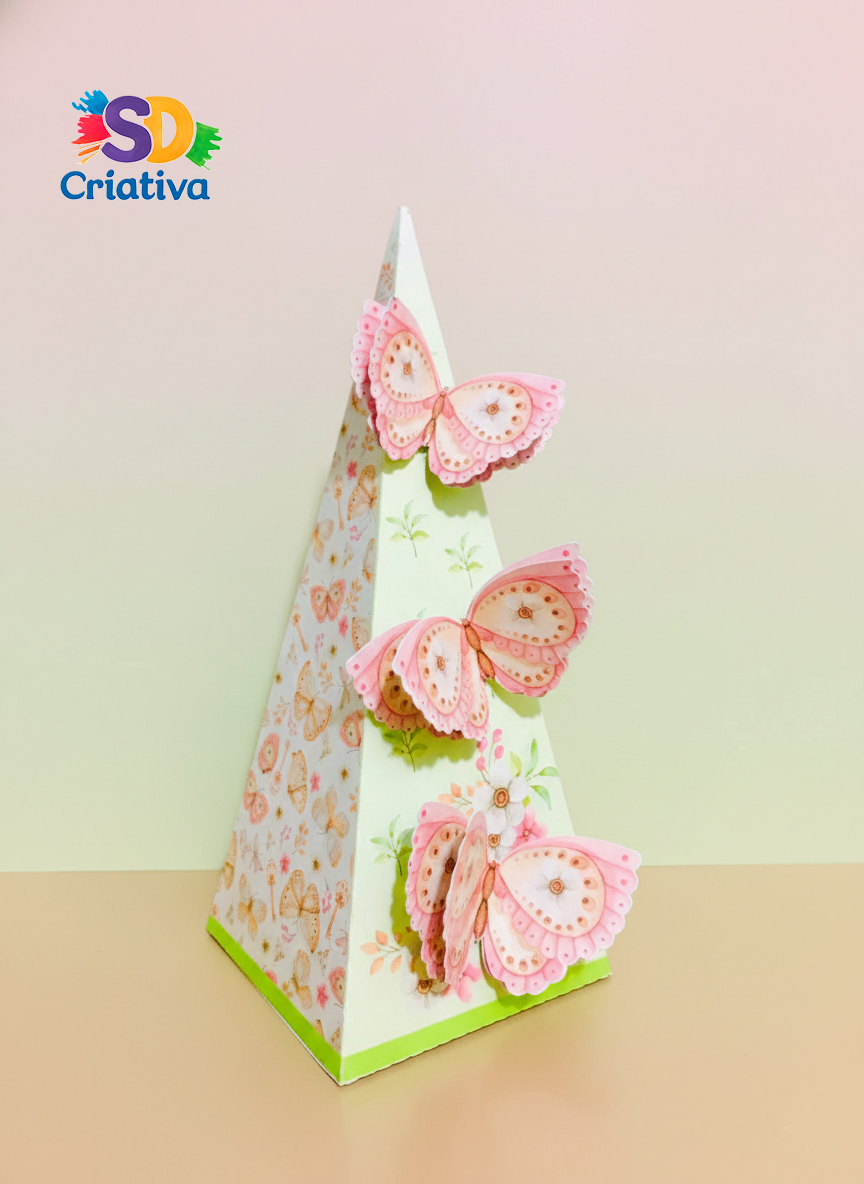 Deixe a natureza invadir sua celebração com a Caixa Pirâmide Jardim de Borboletas da SD Criativa. Projetada para quem busca uma decoração leve, romântica e cheia de vida, esta peça transforma a mesa de doces em um jardim encantado, onde cada detalhe parece ter acabado de pousar para surpreender seus convidados.