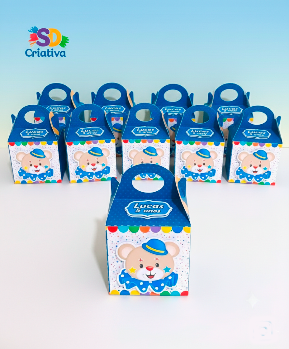 Aplique 3D de Alegria: O centro da caixa destaca o carismático Ursinho Palhaço, aplicado em camadas para criar um relevo que traz profundidade e vida à peça.
