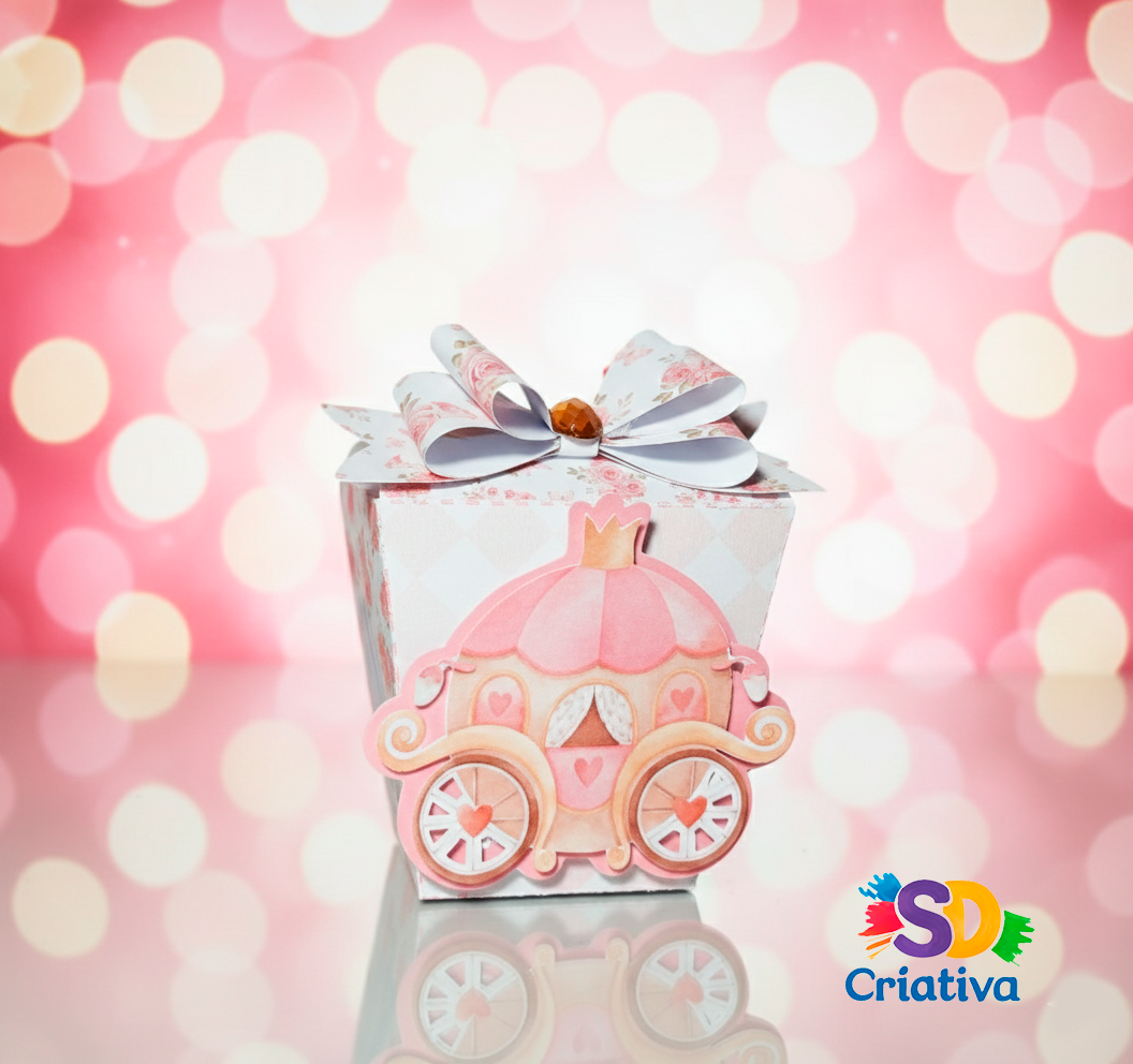 Aplique 3D de Carruagem Encantada: O centro da peça destaca uma carruagem clássica em tons de rosa e pêssego, aplicada em camadas de scrapbook para criar um relevo mágico que remete aos contos de fadas.