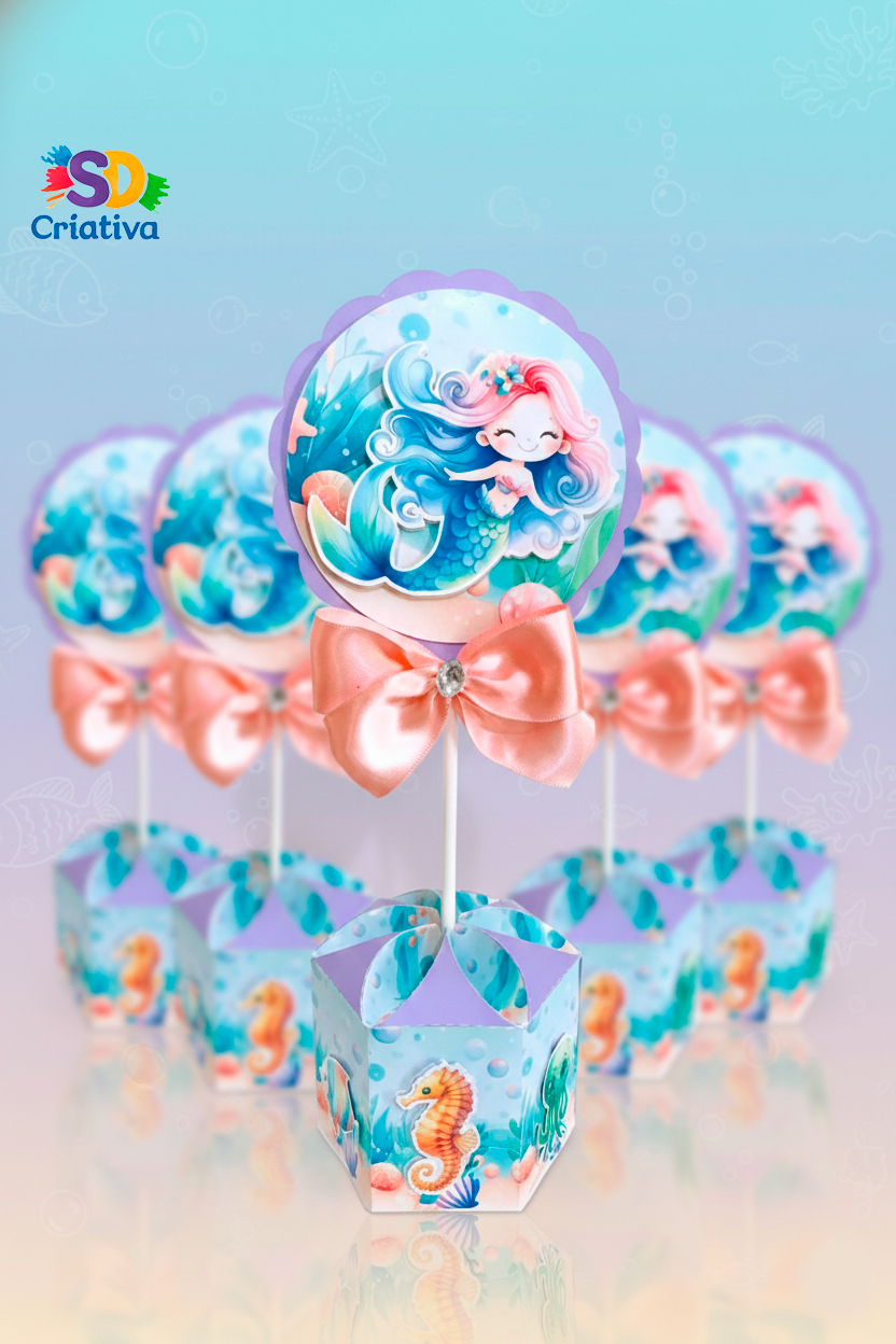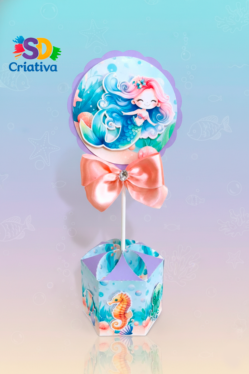 Deixe-se levar pelas ondas da imaginação! O Centro de Mesa Sereias e Fundo do Mar da SD Criativa é a peça central perfeita para transformar sua festa em um verdadeiro reino subaquático. Com um design vertical elegante e detalhes que brilham como pérolas, esta peça traz toda a serenidade e a beleza do oceano para perto dos seus convidados.
