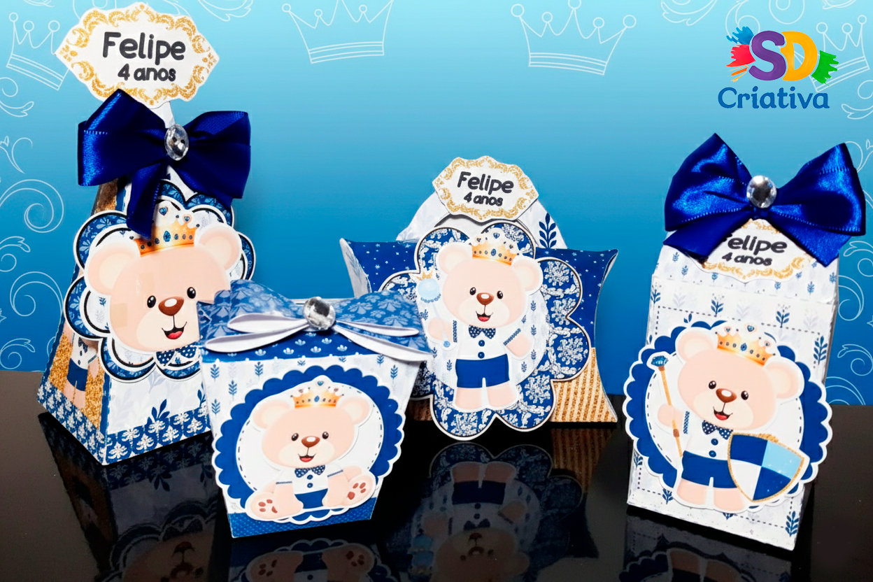 Este Kit Luxo “Ursinho Príncipe” em tons de azul marinho, dourado e branco traz toda a elegância de um reinado para a sua festa. Confeccionado em papelaria de alta gramatura, possui acabamento impecável com laços de cetim luxuosos, pedrarias brilhantes e apliques 3D que destacam a coroa e o ursinho realeza. Ideal para aniversários de 1 ano, Chás de Bebê ou Batizados.