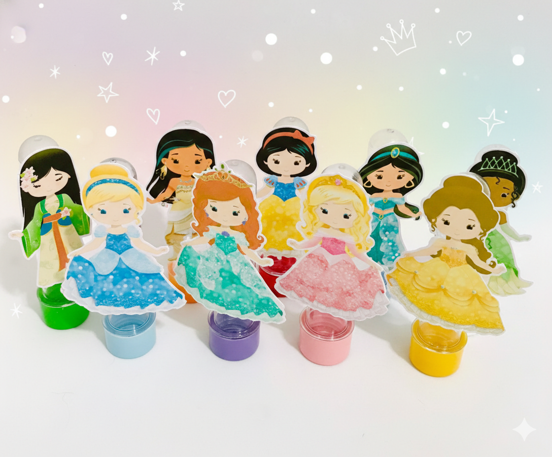• Coleção Completa de Realeza: O kit apresenta uma variedade incrível de personagens (como Branca de Neve, Cinderela, Bela, Ariel, Aurora, Jasmine e outras), permitindo que cada convidado escolha sua princesa favorita.