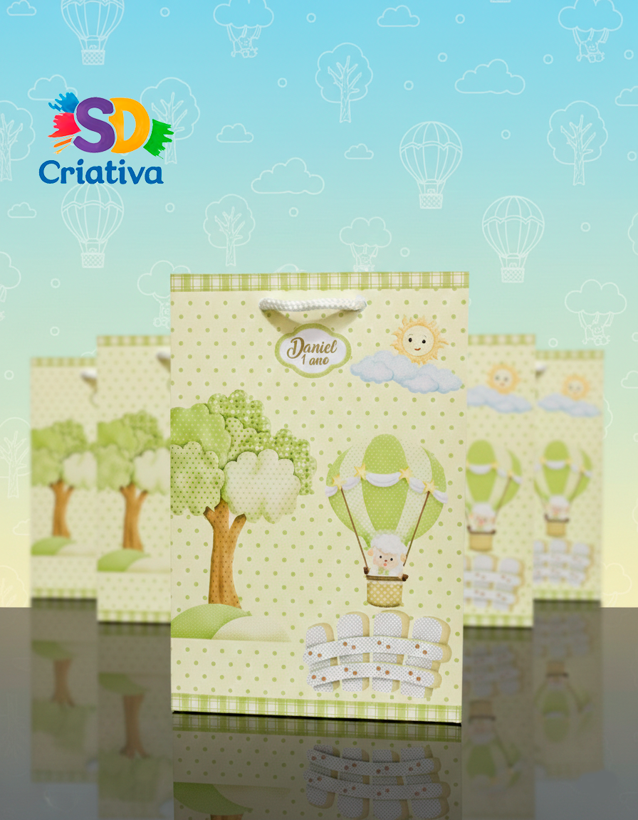 • Design Lúdico e Suave: A sacolinha apresenta uma ilustração adorável de uma ovelhinha viajando em um balão a gás, cercada por árvores fofinhas, nuvens e um sol radiante.