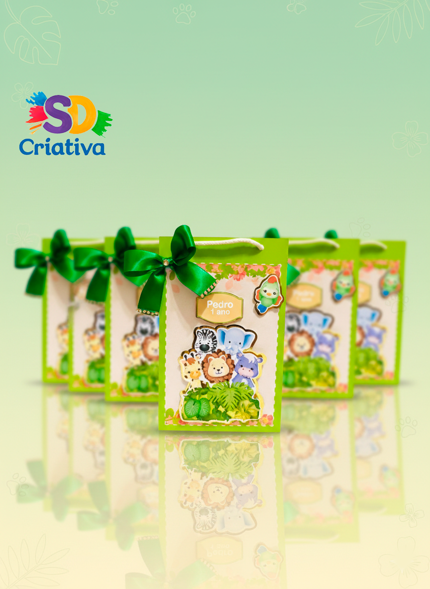 Personagens em Destaque (3D): A frente da sacolinha apresenta um grupo de animais fofinhos (leão, elefante, zebra e hipopótamo) aplicados em camadas de scrapbook, criando um relevo encantador que traz vida ao tema.
