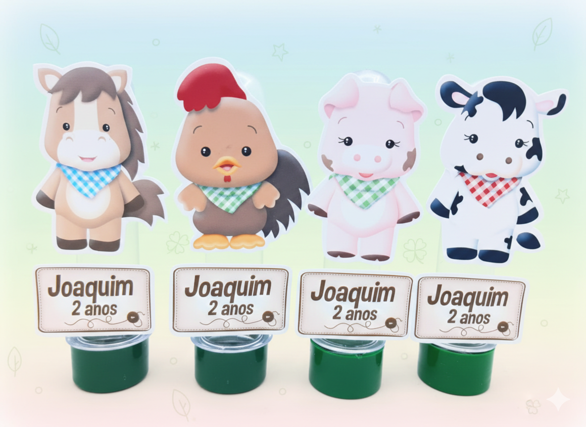 Personagens Carismáticos: Os tubetes destacam os animais da fazenda (como o cachorrinho sapeca, o pintinho amarelinho, a vaquinha mimosa e a galinha charmosa) com apliques de alta precisão que trazem vida ao tema.
